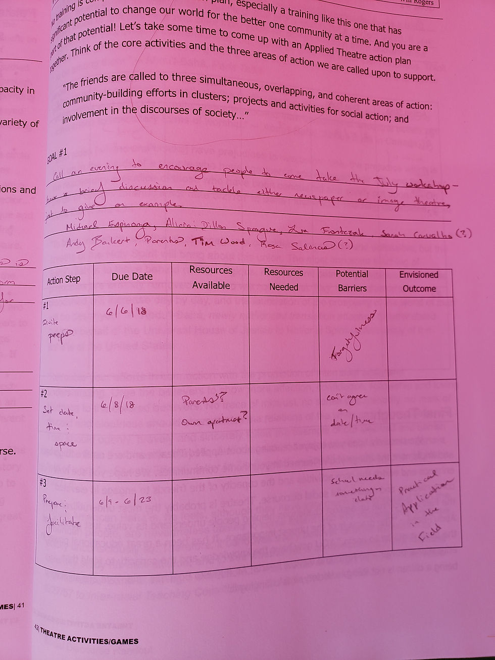 Here is the link to my Atlanta Applied Theatre prep document where there is the layout of the program I used... https://drive.google.com/open?id=1Veg8FkPqR8Ew-830PBIJTIXHYvTOQLmx Don't forget to upload the pics of your action plans!
